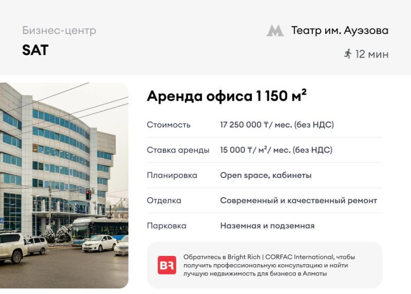 Аренда офиса в бизнес-центре SAT. Светлый офисный блок на 4 этаже. Удобная транспортная развязка - 12 минут пешком до станции метро театр им. Ауэзова. Площадь: 1150..