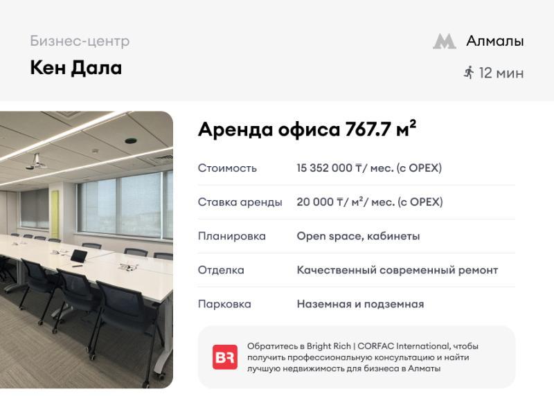 Аренда офисов в бизнес-центре Кен Дала. В аренду предлагается обособленный офисный блок, включающий переговорную, конференц-зал, кухню и серверную. На первом этаже расположен просторный open space, в котором благодаря большим окнам и высоким потолкам много естественного света. - Площадь: 733 м² - Отделка: современный качественный ремонт - Планировка: open space, кабинеты - Паркинг: наземный на 147 мест - Метро: Алмалы - 12 минут пешком Ставка аренды: 20 000 ₸/м² в месяц с эксплуатационными расходами (ОРЕХ). Без комиссии и переплат. Подписание договора напрямую с собственником. Звоните, мы оперативно организуем просмотр в удобную для вас дату и ответим на все интересующие вопросы.