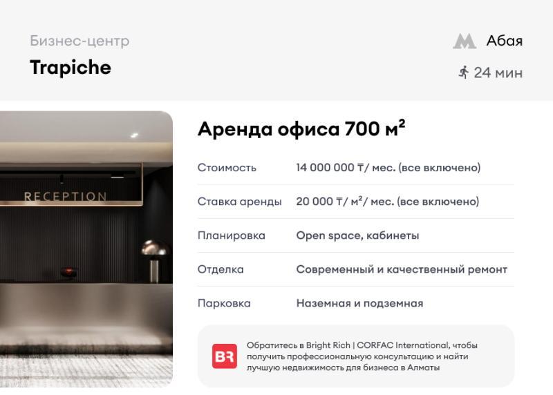 Аренда офиса в бизнес-центре Trapiche. Новый бизнес-центр 2025 года постройки. В аренду предлагается офис 700м². Панорамное остекление обеспечивает обилие естественного света и прекрасные видовые характеристики. В ставку включено абсолютно всё, в том числе оснащение мебелью, орг. техникой и расходными материалами. Есть оборудованная кухня для арендаторов. Площадь: 700 м². Отделка: современный качественный ремонт. Планировка: open space. Ставка аренды: 20 000 ₸/м² в месяц. В ставку включены: коммунальные услуги, эксплуатационные расходы, НДС, электричество, уборка, интернет. Без комиссии и переплат. Подписание договора напрямую с собственником. Звоните, мы оперативно организуем просмотр в удобную для вас дату и ответим на все интересующие вопросы.