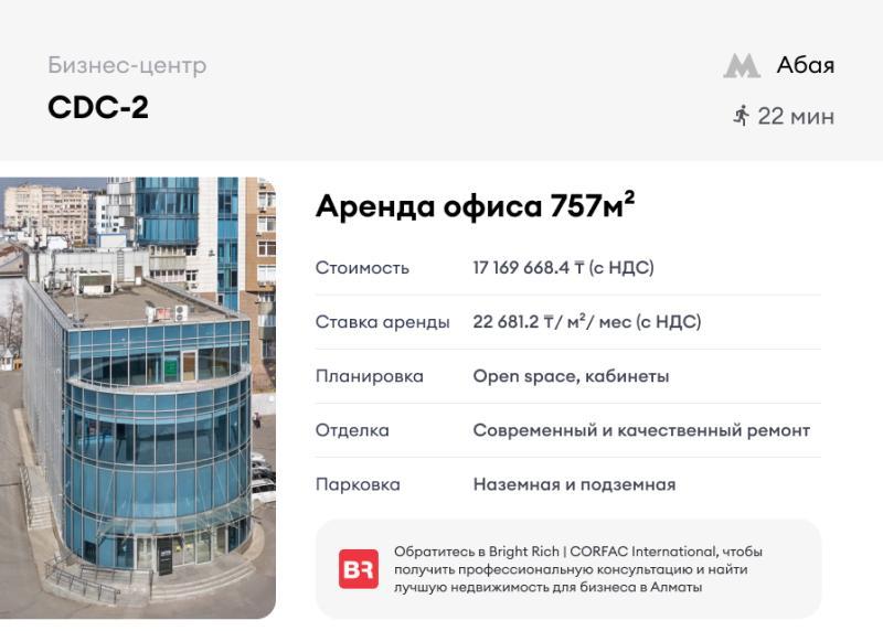 Аренда офиса в бизнес центре CDC-2. Удобное расположение - угол Аль-Фараби - Назарбаева. Без комиссии и переплат. Подписание договора напрямую с собственником. В аренду предлагается два этажа полностью. Офис с ремонтом, готов ко въезду. - Площадь: 757 м² - Этаж: сумма 1 и 2 этажа - Планировка: open space, кабинеты - Метро: Абая Ставка аренды: 22 681. 2 ₸/м² в месяц. В ставку включен НДС. Звоните, мы оперативно организуем просмотр в удобную для вас дату и ответим на все интересующие вопросы.