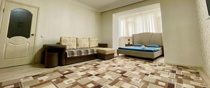 Просторная квартира на 1-ом этаже с большой кухней с раскладным диваном. Находится сзади Облгаи, рядом с Метро, гипермаркетом Дина, теннисным центром, ледовым дворцом, Жекпежек, кафе Анталия..