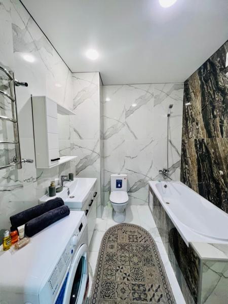 Сдается новая 1 комн квартира с современным ремонтом в ЖК бизнес-класса Сириус Расположение: ул. Жамбыла уг. Айтиева. Фото соответствует. Квартира полностью оснащена посудой, техникой. Локация-самый центр..