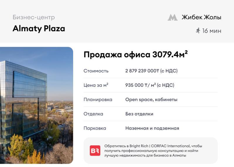 Продажа офисов в бизнес-центре Almaty Plaza. Новый бизнес-центр A-класса. В продажу предлагаются офисы от 750 м² до 11 018. 3 м² (несколько этажей целиком). Панорамное остекление..